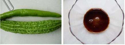 1、苦瓜洗净,切片;尖椒洗净,去皮和籽,切片。