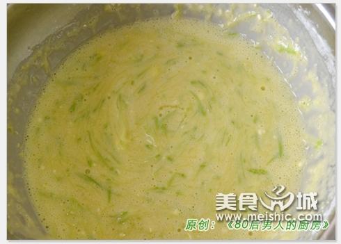 2:西葫芦出水后,打入一个鸡蛋搅散,加入面粉、葱姜末和少许五香粉,搅拌均匀直到面糊与西葫芦丝均匀的混合在一起,用勺子盛起呈黏稠状,但还可以缓慢流动。