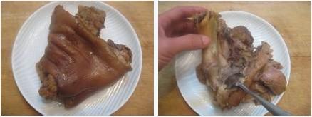 我看到很多人做肘花都喜欢先把肘子的骨头剔除了再煮,我觉得那样比较麻烦,还需要用纱布包裹好,再用棉线捆好才能煮。我想,肉生的和熟的形态体积都会发生变化吧,如果开始捆绑定型最后形状一定不会很结实。不过我也没有试过,也不知道是否会像我想像的那样子呢?改天再试试看了。