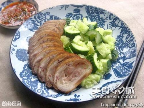 4.黄瓜洗干净,用刀拍扁,再切成小段,与肘子肉一同码放入盘中;