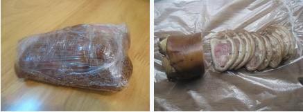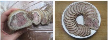 3.将卤好的肘子留在卤汤中浸泡至50度,然后捞出,趁热用刀将肘子的一面破开,剔除骨头,再把肘子卷起来,用保鲜膜包裹严实,放入冰箱,冷藏半天就定型了,然后拆掉包装,切成圆片即可;