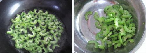 1、将苦瓜用小刷子仔细刷洗干净后切开,去瓤,切成厚片。