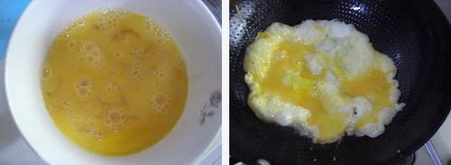 4、锅中热油,下入打散的鸡蛋,鸡蛋成型后,拨到锅边(或盛出)。