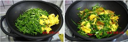 6.倒入韭菜和鸡蛋,翻炒20秒,即可出锅。