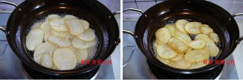 4.将土豆片捞出,控干水份,入油锅炸制5分钟以上,直到土豆片硬挺,捞出备用。