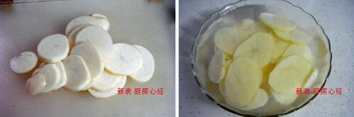 3.土豆顶刀切成5毫米厚片。泡入水中。