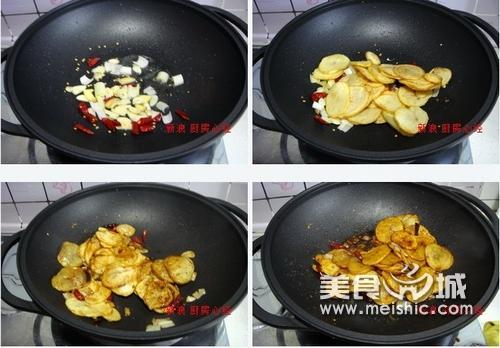 5.锅中放油,爆香葱姜蒜;干辣椒后,倒入炸好的土豆片,调入15克酱油,加入2汤匙清水,焖制10-20秒。