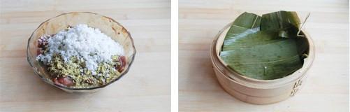 6、棕叶用开水烫过,铺在圆笼里,将拌好的排骨与米一起放入圆笼中,盖上棕叶,扣是一个盘子,防止棕叶翘起