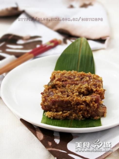 材料:猪肋排500克、黑小米80克、小米80克、糯米50克、棕叶4个