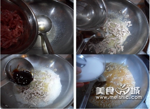 3、热锅凉油,放入腌好的肉丝煸炒至变色,加入少许清水、蚝油,煸炒均匀后,倒入水淀粉勾芡,关火。