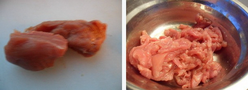 2、瘦猪肉切成细丝,放入盆中,加入盐、料酒腌制一会儿。