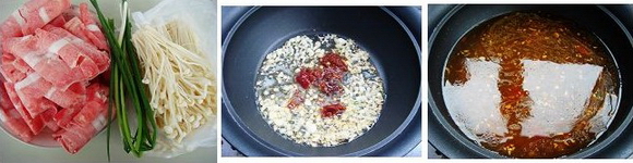 原料:肥牛片250克,金针菇300克,葱花适量,陴县豆瓣酱1汤匙,盐,蒜蓉和油适量。