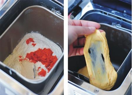 材料:高粉250克、水138克、酵母3、盐3克、砂糖35克、奶粉10克、黄油20克\胡萝卜泥50克(蒸熟放冷压碎成泥,如果胡萝卜泥水份大,要注意减水)