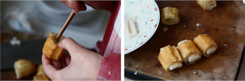 3.用一只筷子掏空油条的内部(掏空部分的大小以能插入藕段为佳)。