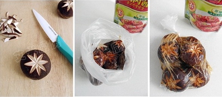 2.取一个食品保鲜袋,将打好花刀的香菇装入袋中,再往袋中倒适量的烤肉酱,然后挤净袋子里的空气,系紧袋口,用手揉捏袋子中的香菇,这样能使烤肉酱与香菇更好的拌匀,然后放冰箱冷藏1-2个小时。