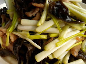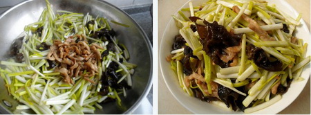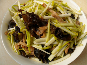 5、另起锅,放入少量的油烧热,倒入韭黄快速的煸炒后,倒入木耳炒匀,再放入肉丝煸炒均匀后,加入盐调味即可。