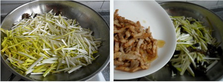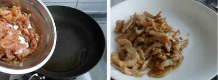 4、热锅凉油,放入下肉丝,大火煸炒至变色后盛出。
