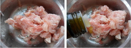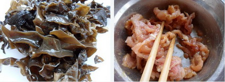 2、炒之前在腌制后的肉丝里加一小勺植物油拌匀;并且把泡发的木耳摘洗干净,撕成小块。