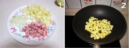 1.土豆去皮切小丁,冲去淀粉后沥干。培根和洋葱也切丁;