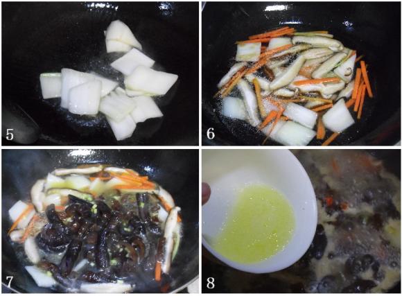 6、再放入香菇、胡萝卜丝一起炒,加适量的水