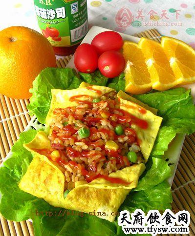 原料:米饭750克,鸡蛋500克,猪通脊肉丁250克,葱头丁、酸黄瓜、豌豆各100克,番茄酱200克,精盐、白糖适量,花生油150克。