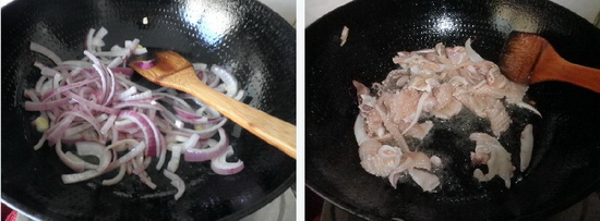 4,炒锅入油,油热后将洋葱条滑一遍油,不要久炒,撒1克盐,翻两下盛出备用。