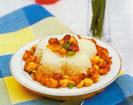 提示:米粒经炒过,再蒸制,比一般蒸煮饭类较具粘性,独具风味特色。