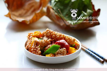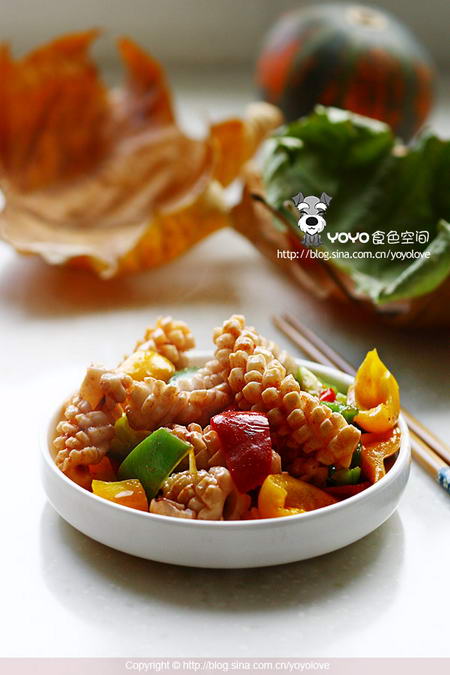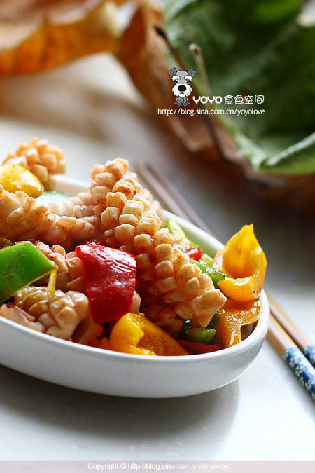 鱿鱼花,看着复杂,切起来简单。你要没信心,找一个块萝卜,练习下准成:斜着切,别切透,跟划横格一样,距离尽量一致就可以,一面切完,给鱿鱼旋转90度,再切一遍,最后分成小块,就等着鱿鱼在锅中变成玉米穗吧O(∩_∩)O 那什么,有各种密集物恐惧症的,就不用仔细端详了哈。