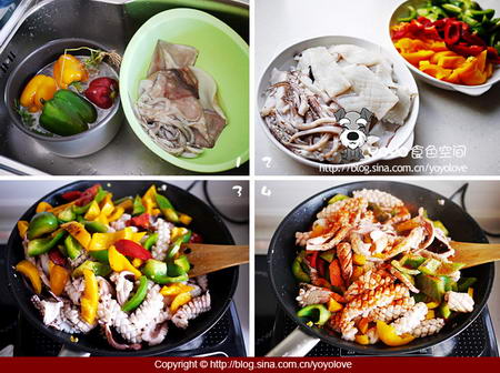 1、鱿鱼洗净切花刀,辣椒切块。鱿鱼在沸水中汆烫捞出备用。
