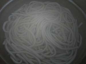 2、土豆粉入开水锅里焯一下,捞出沥干水。