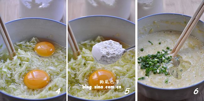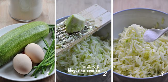 西葫芦擦丝、用盐杀一杀、再和鸡蛋面粉葱花拌和在一起,用平底锅煎熟,热热的软乎乎的,真香真好吃!做成小煎饼,一会儿就熟,不耽误太多时间,很适合当早餐。