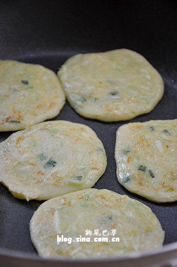 8.锅微热后,转小火,舀入1勺面糊,摊入平底锅中。基本上一勺面糊就是一个小煎饼。——记得用小火就好。火大了,煎饼里面没熟外面焦黑掉! 第一页 1/2下一页
