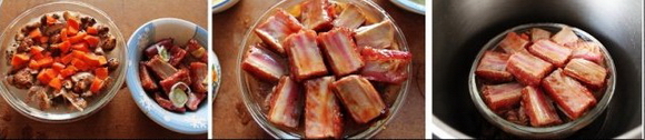 4.炒好的大米冲洗干净,然后倒进玻璃碗里,加适量的水。注意水要比电饭煲蒸米饭时少一些,因为排骨在蒸的过程中也会出汁。大米上面摆上一层花菇片再摆上一层胡萝卜块。