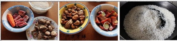 材料:大米一碗,花菇一盘,排骨一碗,还有胡萝卜半根