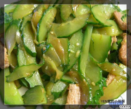 黄瓜炒肉片原料:黄瓜500克,猪肉250克,精盐10克,醋5克,味精25克,花椒10粒,于辣椒2个,白糖、大葱、生姜各凹克,淀粉5克,油刀克。