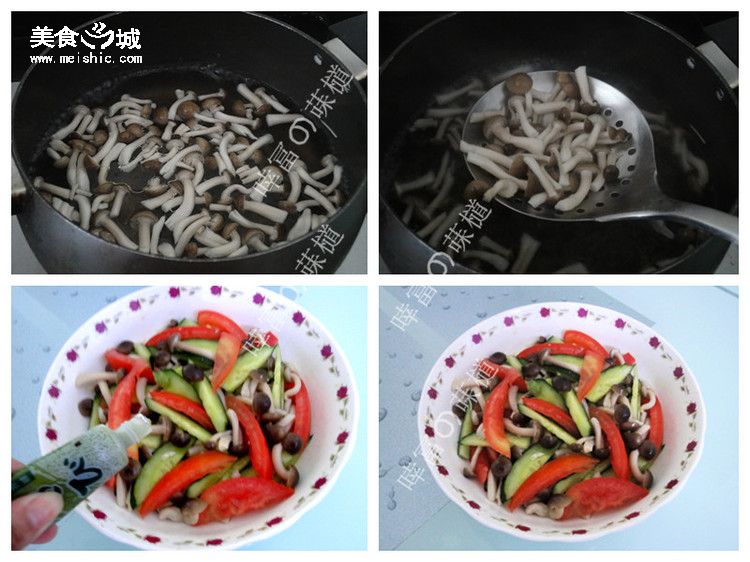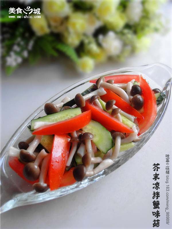 材料:蟹味菇、黄瓜、蕃茄、蒜末。