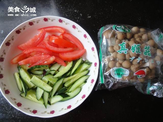1、将所有食材洗净,蟹味菇切去根部,洗净,黄瓜、蕃茄切片。