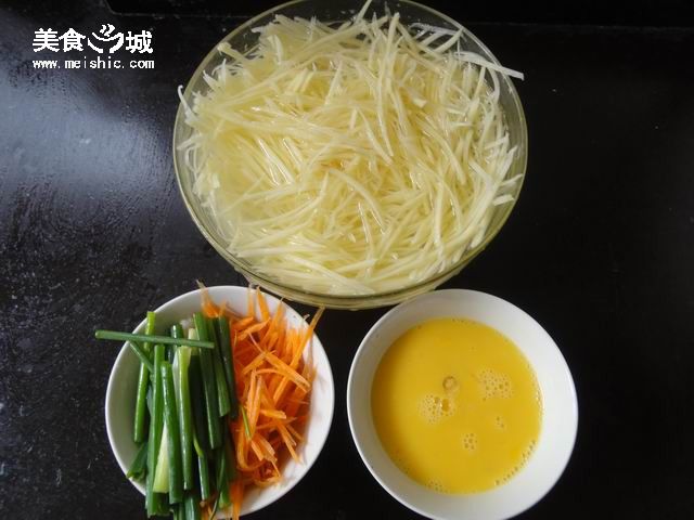 1、土豆、红罗卜削去外皮,洗净切丝,土豆丝用清水浸泡。