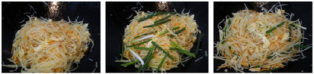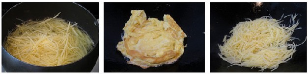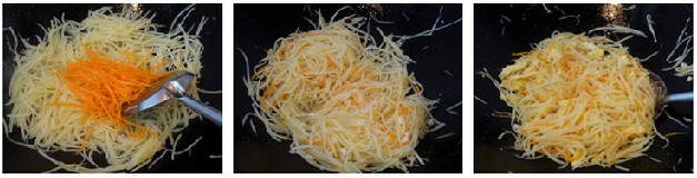 5、再加适量油烧热,放土豆丝、红罗卜丝大火快炒,因土豆丝已焯过,所以炒香后即可加入炒好的鸡蛋拌匀,加适量盐、鸡精调味,淋几滴麻油装碟上桌即可。