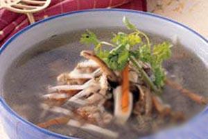 特点:此汤用紫菜同笋子、豆腐干等制成,鲜香可口,有开胃去腻之功效,用于一般宴会作原汤。